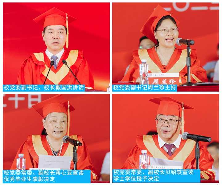 校党委副书记、校长戴国洪作题为《躬身笃行坚持奋斗 争做挺膺担当的新时代青年》的讲话。他深情地祝贺同学们四年学有所成,为大家的成长和进步感到喜悦和自豪,并向悉心培养他们的老师、辛勤培育他们的家人和一路陪伴他们的亲友致以诚挚的敬意和衷心的感谢!围绕责任,戴国洪对即将离开校园的毕业生提出三点期望:一是要在理想信念中锚定前进方向,成为“心中有光”的逐梦青年,心有所信,方能行远,始终要让理想信念“不含糊”、理想信念“不缺位”、理想信念“不迷航”;二是要在敦品励学中增强干事本领,成为“手上有力”的勤学青年,要适应学习的新常态、珍视学习的新价值、转换学习的新路径;三是要在笃行奋斗中矢志奉献社会,成为“脚下有路”的担当青年,脚下有路,离不开拼搏斗志,少不得奉献精神,缺不了家国情怀。最后他希望全体毕业生以梦为马,奋斗为剑,不负韶华,不负时代,也衷心祝愿全体毕业生身体健康,前程似锦!