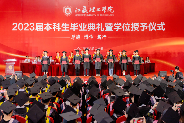 毕业生代表、汽车与交通工程学院虞佳杰分享大学四年的成长和收获,表达了对母校、师长的感恩与不舍,承诺将继续秉承“厚德、博学、笃行”的校训精神,勇担社会责任,在实现中国梦的实践中绽放青春光彩。国际教育学院留学生代表艾莎感谢学校一路的引导和呵护,让她顺利度过温暖、快乐、充实的大学时光,表示毕业后会继续传播中华优秀传统文化。我校90届杰出校友、江苏省特级教师、江苏省职业教育领军人才、江苏省溧阳中等专业学校党委书记、校长王云清回顾了在母校的求学经历,感激母校的培育之恩,勉励学弟学妹以岗位立身,用时间打磨水平,以责任支撑发展,用兴趣激发激情,以反思促进成长。毕业典礼现场还播放了各二级学院院长提前录制好的视频,表达了老师对毕业生的殷殷嘱托和热切期盼。