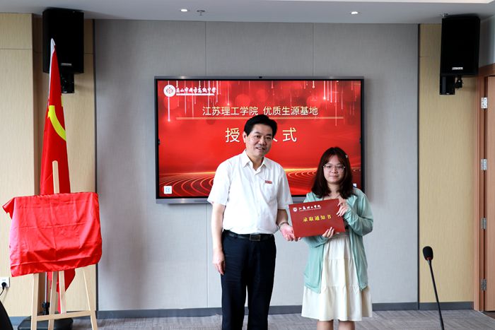 两所高中校长对江苏理工学院一行的到来表示欢迎,并对各自的学校做了介绍。戴国洪为27名优秀学子一一颁发了录取通知书,周兰珍为两所学校颁发了“江苏理工学院优质生源基地”牌。