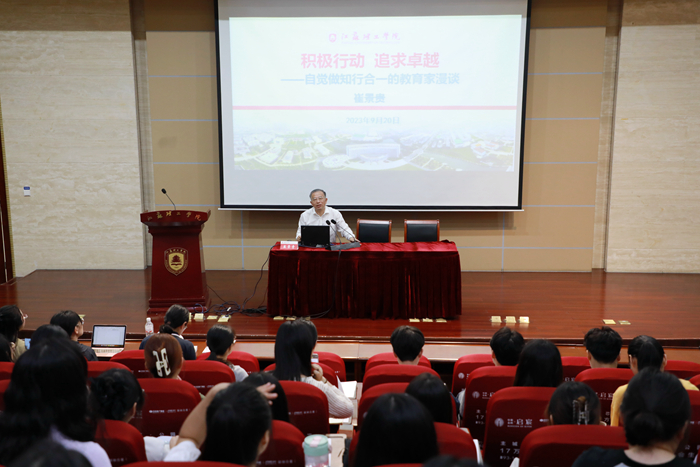崔景贵对2023级教育硕士研究生表示热烈欢迎,并作《积极行动,追求卓越——自觉做知行合一的教育家漫谈》首场专题报告。崔景贵在报告中强调,要自觉学习习近平总书记关于教育的一系列重要论述,自觉学思践悟中国特有的教育家精神,自觉成为有理想、敢担当、能吃苦、肯奋斗的新时代好青年,为办好人民满意的现代化职业教育、健全中国特色职教教师教育体系贡献青春智慧和力量。崔景贵勉励全体教育硕士研究生志存高远、脚踏实地,敢想敢为、善作善成,始终用积极心态面对过去,用积极行动把握现在,用积极奋斗成就未来,自觉做职校学生全面发展与个性发展需要的“四有”好老师,自觉做严爱相济、润己泽人的“大先生”“工程师”和“引路人”,奋力书写精彩卓越的教育人生新篇章。