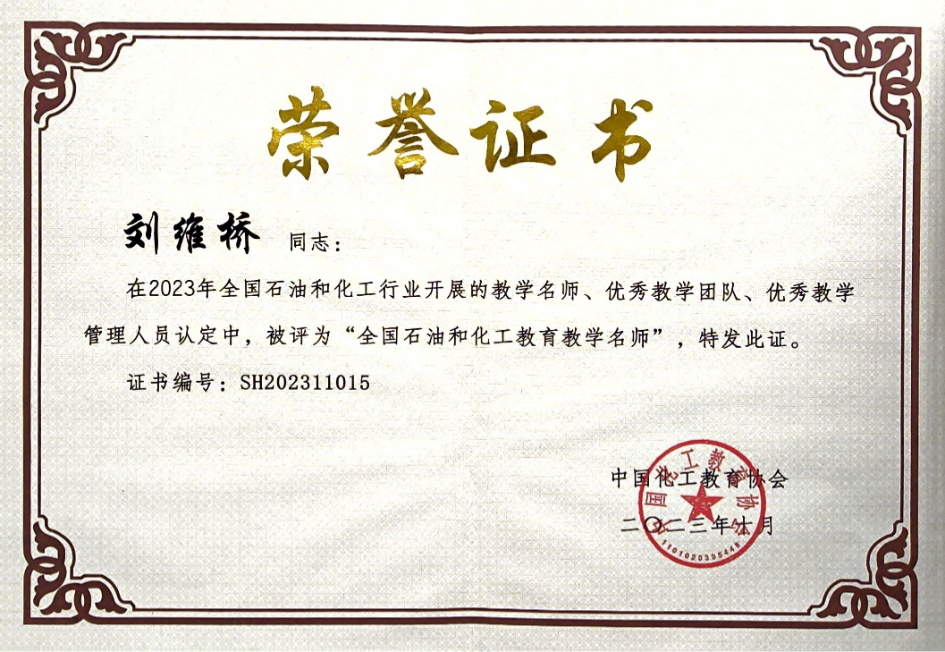 12月8日至10日,中国化工教育年会在福建泉州召开。会上举行了2023年全国石油和化工教育教学名师、优秀教学团队及优秀教学管理人员颁奖仪式,我校化学化工学院刘维桥教授获“全国石油和化工教育教学名师”荣誉称号,并作为名师代表受中国化工教育协会邀请到场参加了颁奖仪式。