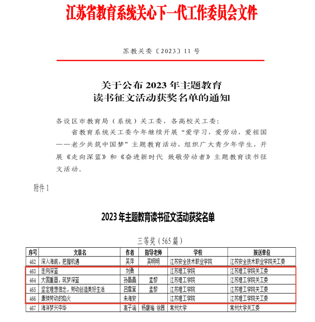 在省教育系统关工委主题教育读书征文活动评选中,我校关工委报送的征文《走向深蓝》《大国重器,筑梦深蓝》《坚定理想信念,劳动创造美好生活》《赓续劳动的焰火》喜获三等奖。