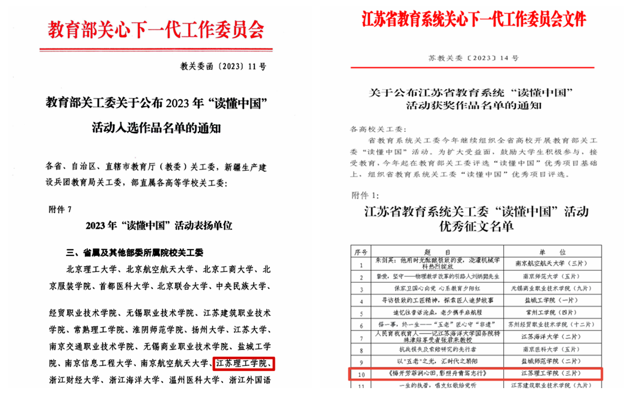 在教育部关工委评选“读懂中国”优秀项目中,我校关工委入选教育部关工委表扬单位名单。在省教育系统关工委“读懂中国”活动评选中,我校关工委报送的征文《梅开芳菲润心田,影照丹青笃志行》(作者:文化与旅游学院 张赟)被评为江苏省教育系统关工委“读懂中国”活动优秀征文,这是我校关工委首次获得“读懂中国”活动评选奖项。