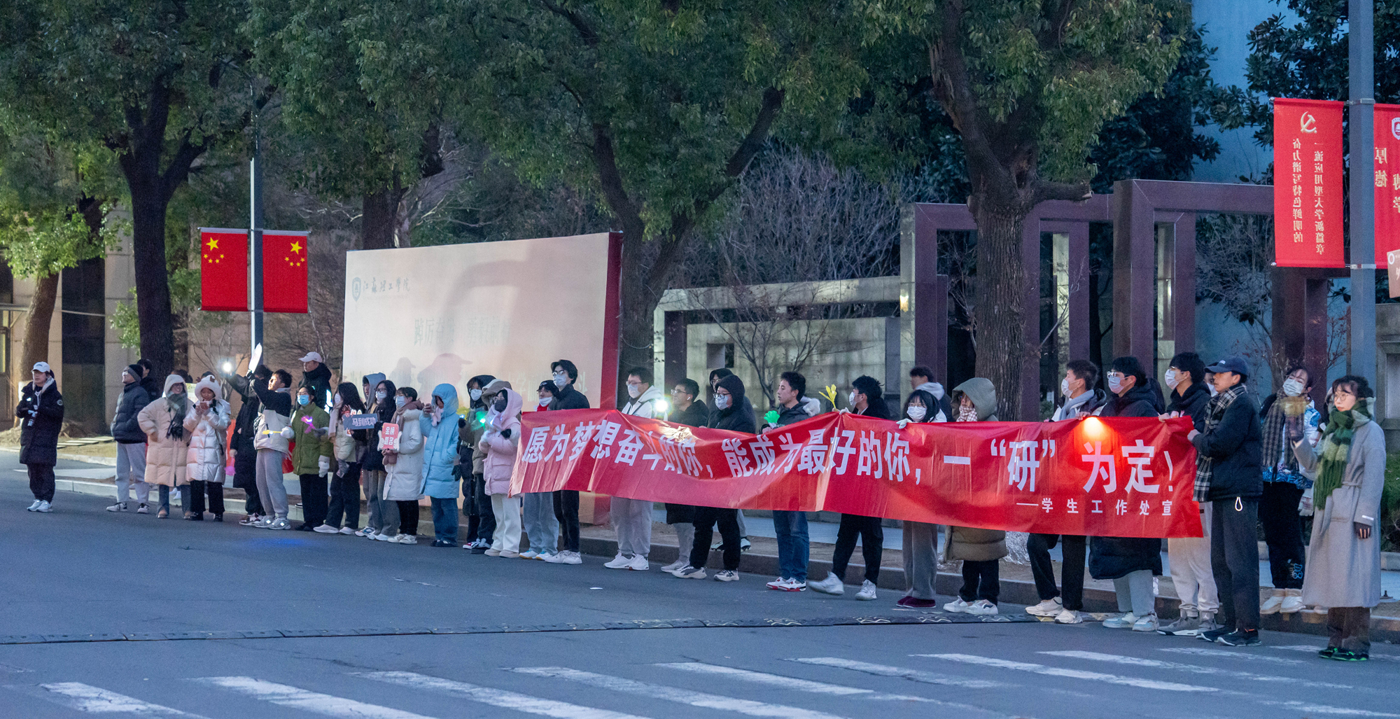 23日清晨,崔景贵、俞亚萍一行来到送考现场,看望送考的教师与考研学生,勉励考研学子放松心态、沉着应考,祝福考生考出满意成绩,圆梦理想高校。学生志愿者在现场手举“愿为梦想奋斗的你,能成为最好的你,一‘研’为定!”的宣传横幅为考生加油鼓劲,校园里也满是“凌云壮志展宏图,锦绣前程幸福路”“一战成硕”“金榜题名”等祝福语。尽管天气严寒,但考研学子的心间却暖意浓浓。