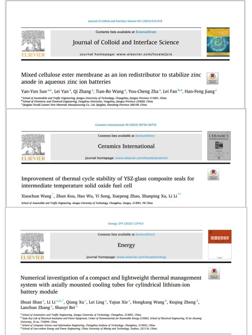 据团队负责人李丽介绍,该团队2023年取得了多项重要研究成果,已发表高水平论文10篇(其中中国科学院一区论文8篇,二区2篇),其中在《Journal of Colloid and Interface Science》期刊上发表题为“Mixed cellulose ester membrane as an ion redistributor to stabilize zinc anode in aqueous zinc ion batteries”的研究论文(论文链接为:https://doi.org/10.1016/j.jcis.2023.03.079),我校为该论文第一单位,团队骨干成员孙艳云为第一作者;在《Ceramics International》期刊上发表题为“Improvement of thermal cycle stability of YSZ-glass composite seals for intermediate temperature solid oxide fuel cell”的研究论文(论文链接为:https://doi.org/10.1016/j.ceramint.2023.08.359),我校为该论文第一单位,团队骨干成员王晓春为第一作者。在《Energy》上发表题为“Numerical investigation of a compact and lightweight thermal management system with axially mounted cooling tubes for cylindrical lithium-ion battery module”的研究论文(论文链接为:https://doi.org/10.1016/j.energy.2023.127410),团队成员、汽车与交通工程学院硕士研究生单帅为第一作者,团队负责人李丽老师为通讯作者。