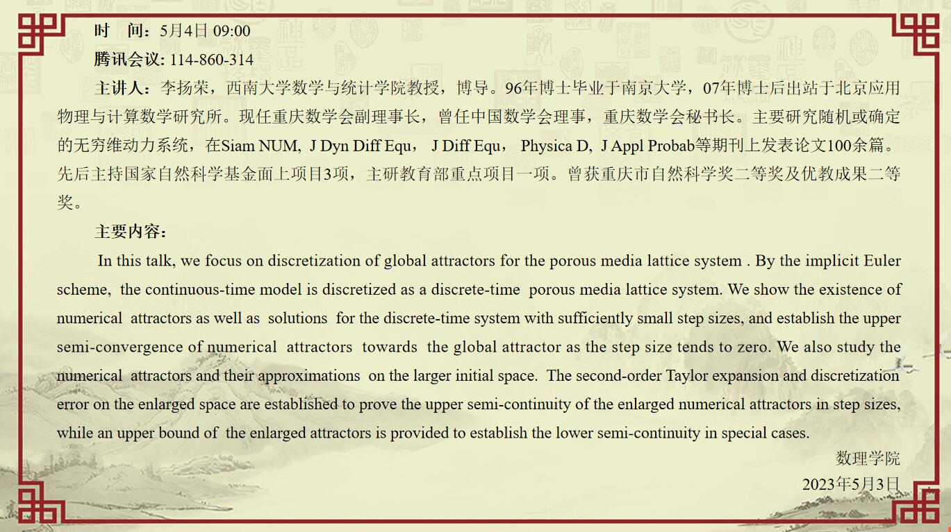 5月4日:Numerical attractors and approximations for porous media lattice systems
