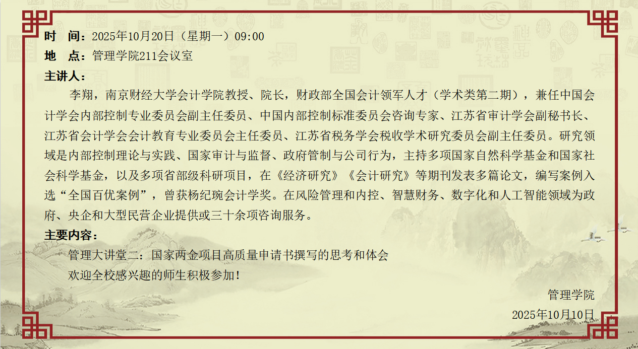 10月20日:管理大讲堂二:国家两金项目高质量申请书撰写的思考和体会