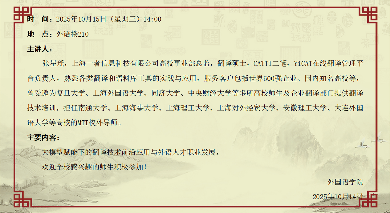 10月15日:大模型赋能下的翻译技术前沿应用与外语人才职业发展